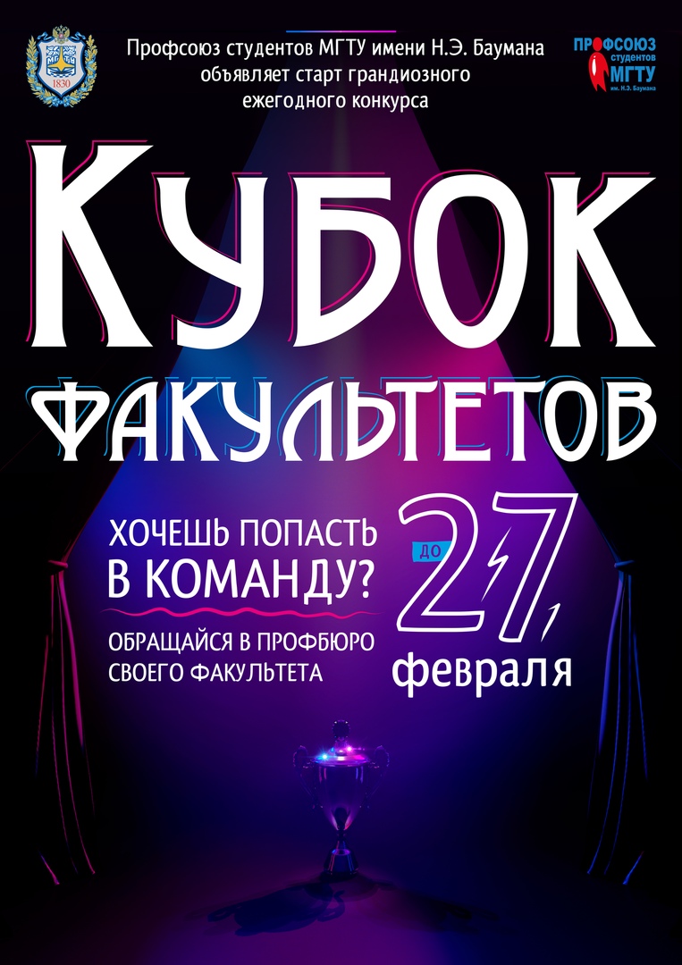 Профсоюз студентов МГТУ им. Н.Э. Баумана объявляет о НАЧАЛЕ РЕГИСТРАЦИИ команд на конкурс «Кубок факультетов — 2019»